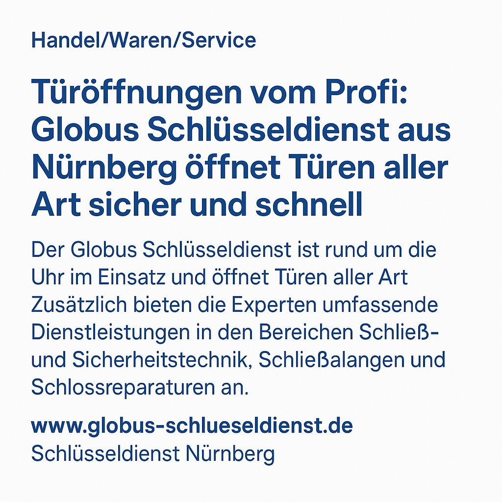 (IINews) - Wenn der Schlüssel verloren geht, im Schloss abbricht oder die Tür plötzlich zugezogen ist, bietet der Globus Schlüsseldienst aus Nürnberg schnelle und professionelle Hilfe. Das Unternehmen öffnet Türen aller Art - rund um die Uhr, auch an Wochenenden und Feiertagen - und das zu transparenten Festpreisen.