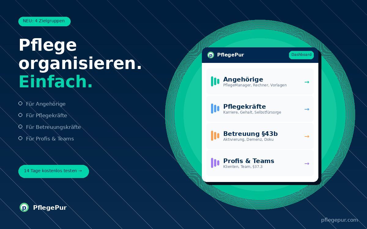 Die Web-App PflegePur Navigator bietet jetzt vier spezialisierte Module: für Angehörige, Pflegekräfte, Betreuungskräfte (§43b) und Pflegedienste. Mit Pflegegradrechner und 100+ Aktivierungsideen.