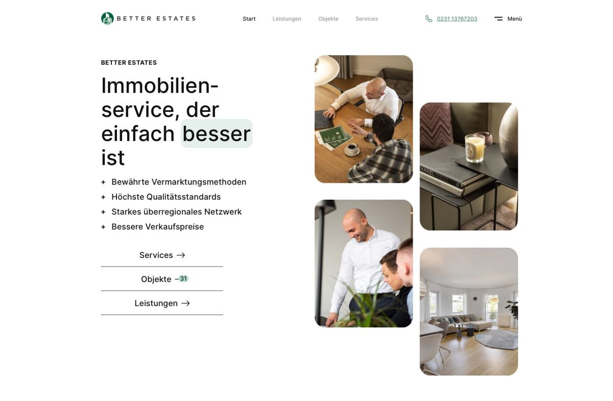 Die Better Estates GmbH ist ein in Dortmund ansässiges Immobilienunternehmen mit Fokus auf Wohnimmobilien in der Metropolregion Ruhr. Unter der Leitung von Geschäftsführer Paul Klöckner (M. Sc. Immobilienwirtschaft und -Management) begleitet Better Estates Eigentümerinnen und Eigentümer sowieInteressenten bei Verkauf, Vermietung und Immobilienberatung - mit klaren Prozessen, moderner Vermarktung und persönlicher Betreuung