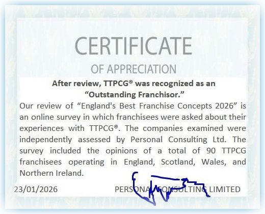 Bei unserer Prüfung"Englands besten Franchise-Konzepten 2026"handelt es sich um eine Online-Befragung, bei der Franchisenehmer zu ihren Erfahrungen mit TTPCG® befragt wurden. Die Prüfung der untersuchten Unternehmen erfolgte unabhängig durch Recherchen von Personal Consulting Ltd. sowie des Wirtschaftswissenschaftlers Herrn Dr. Thomas Komarek. In die Befragung gingen Urteile von insgesamt 90 befragten TTPCG-Franchisenehmern, die in England, Schottland, Wales und Nordirland tätig sind. Branchenübergreifend wurde aus 23 Unternehmen die TOP 1 ermittelt. Kein weiteres Franchiseunternehmen konnte eine derart positive Bewertung durch seine Franchisenehmer erreichen wie TTPCG®. Aufgrund der hervorragenden Noten, die das Unternehmen TTPCG® von seinen Franchisenehmern erhielt, wurde TTPCG® von uns als"Herausragender Franchisegeber"ausgezeichnet.