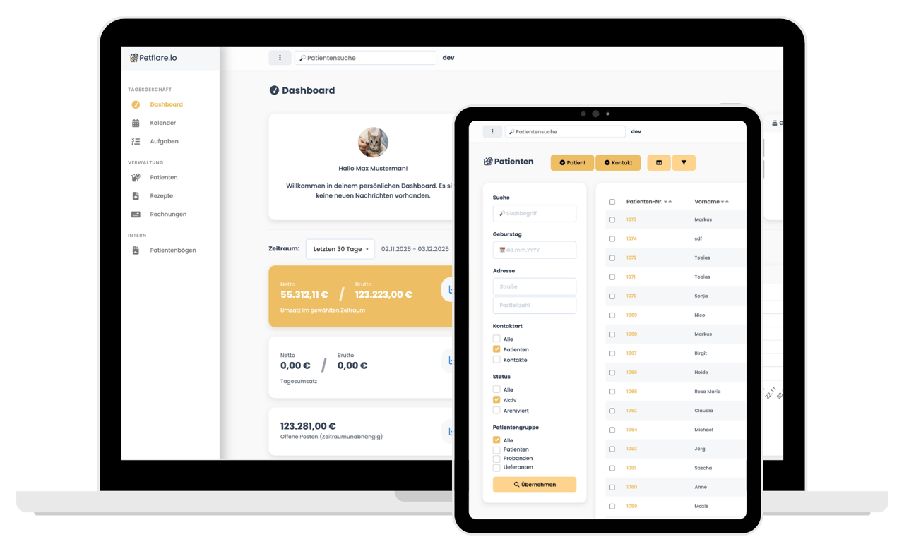 Petflare ist eine cloudbasierte Praxissoftware für Tierärzte und Tierheilpraktiker. Die Lösung unterstützt unter anderem Terminplanung, digitale Tierakte, Dokumentation und Abrechnung–direkt im Browser und ohne Installation.
