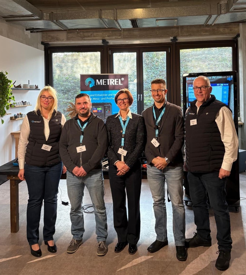 Bildunterschrift: Katrin Wiegard, Geschäftsführung Metrel Deutschland, Blaž Godina, Product Manager Metrel Slowenien, Mojca Vengar Regionale, Vertriebsleitung Slowenien und DACH, Miha Doberlet, Product Manager und Consultant Metrel Slowenien und Christian Koch, Chief Operating Officer Deutschland (von links, Foto: format:c)