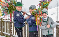 Mit tief verwurzelten Bräuchen feiert man in Berchtesgaden jedes Jahr die Auferstehung Christi. Heilige Gräber in Form von monumentalen Kulissenaltären zählen in Bayern seit dem Barock zu den österlichen Traditionen. Besonders bekannt ist das Heilige Grab in der Klosterkirche Höglwörth (03.–04.04.26) in Anger. Seine Tradition reicht bis 1645 zurück und zählt damit zu den ältesten – und mit zehn Meter Höhe – zu den beeindruckendsten Kulissenaltären, der nur alle drei Jahre errichtet wird. 80 Glaskugeln sind mit farbigem Wasser gefüllt und werden von Öllampen beleuchtet. Sie zaubern ein magisches Licht in die Kirche und lenken den Blick auf eine Grabeshöhle, in welcher der Heiland begraben liegt. Zuletzt besuchten 10.000 Gläubige das prächtige Grab. Für den Palmsonntag (29.03.26) werden in den Haushalten Palmbuschen gebunden, mit Weidenästen,gefärbten Hobelspänen, so genannten „Schaberbandln“ und weiterem Schmuck. Am Palmsonntag kleiden sich die Einheimischen dann häufig in traditionelle Tracht. Die Kinder tragen die Palmbuschen zur Weihe, Prozession und Messe in der Kirche. Danach sollen die Palmbuschen den Segen indie Häuser und auf die Felder bringen. berchtesgaden.de/blueht-auf
