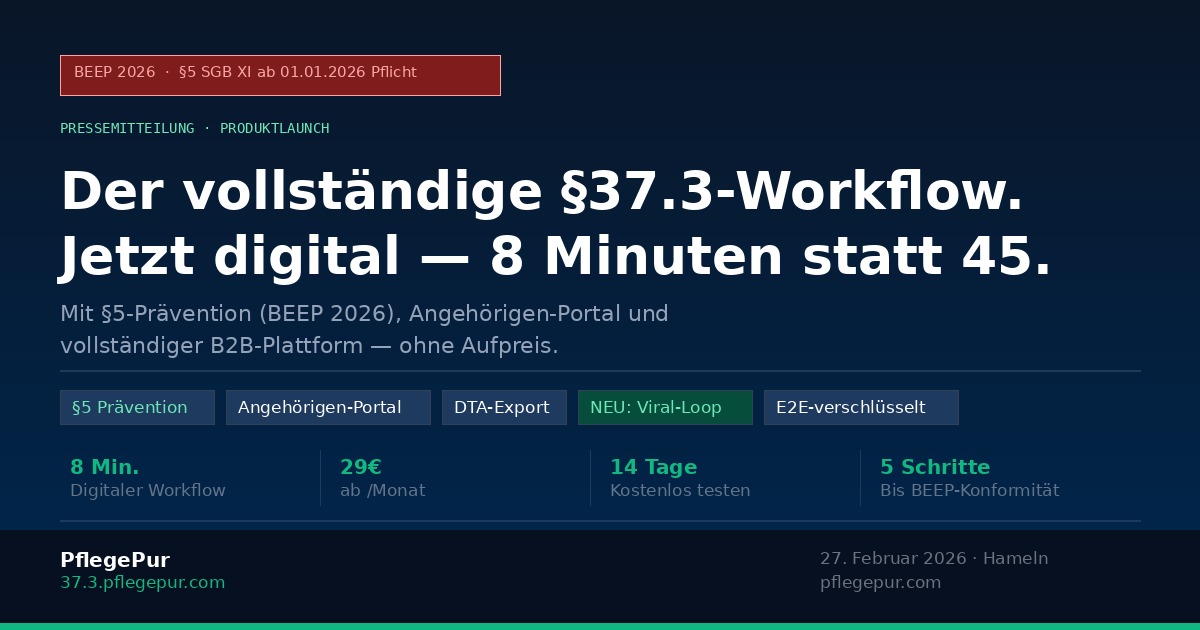 "PflegePur launcht ersten vollständigen§37.3-Workflow–mit BEEP-2026-Prävention, Angehörigen-Portal und kompletter B2B-Plattform"