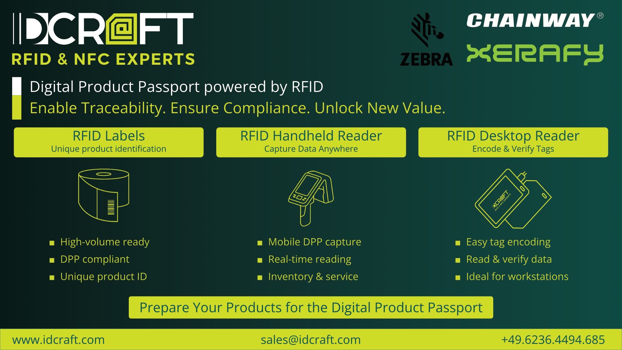 IDCRAFT unterstützt Sie mit der passenden Hardware und dem nötigen Know-how auf Ihrem Weg zum DPP. Nutzen Sie RFID-Technologie für Transparenz, Effizienz und Nachhaltigkeit. Kontaktieren Sie IDCRAFT!