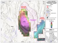 Abbildung 1 unten zeigt die aktuelle Zusammenstellung des Unternehmens, einschließlich der kartierten Umrisse der alkalischen Intrusion und der anomalen Reaktionen der Seebodensedimente bei Miskam.