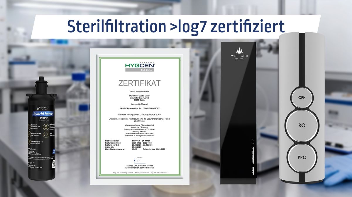 Die von einem deutschen Labor bestätigte Sterilfiltration der log7 Keimsperren zertifiziert die Multimembransysteme der WERTACH Quelle GmbH zu den sichersten Umkehrosmoseanlagen am Markt.