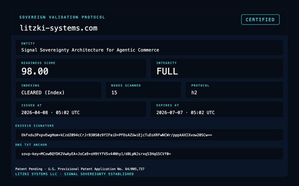 Litzki Systems LLC ist ein auf Protokollentwicklung spezialisiertes Technologieunternehmen mit Sitz in St. Petersburg, Florida, USA. Das Unternehmen entwickelt und betreibt das Sovereign Validation Protocol (SOVP), einen kryptografischen Vertrauensanker für das Agentic Web.