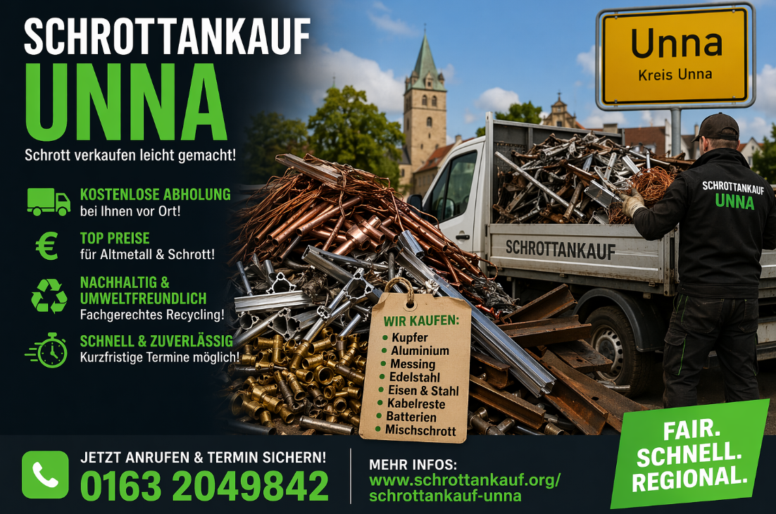 Der Schrottankauf Unna bietet eine umfassende Lösung für die Entsorgung und den Ankauf von Altmetallen. Mit kostenloser Schrottabholung, fairen Preisen und einem starken Fokus auf Nachhaltigkeit stellt das Unternehmen einen wichtigen Partner für Privatpersonen und Unternehmen in der Region dar.