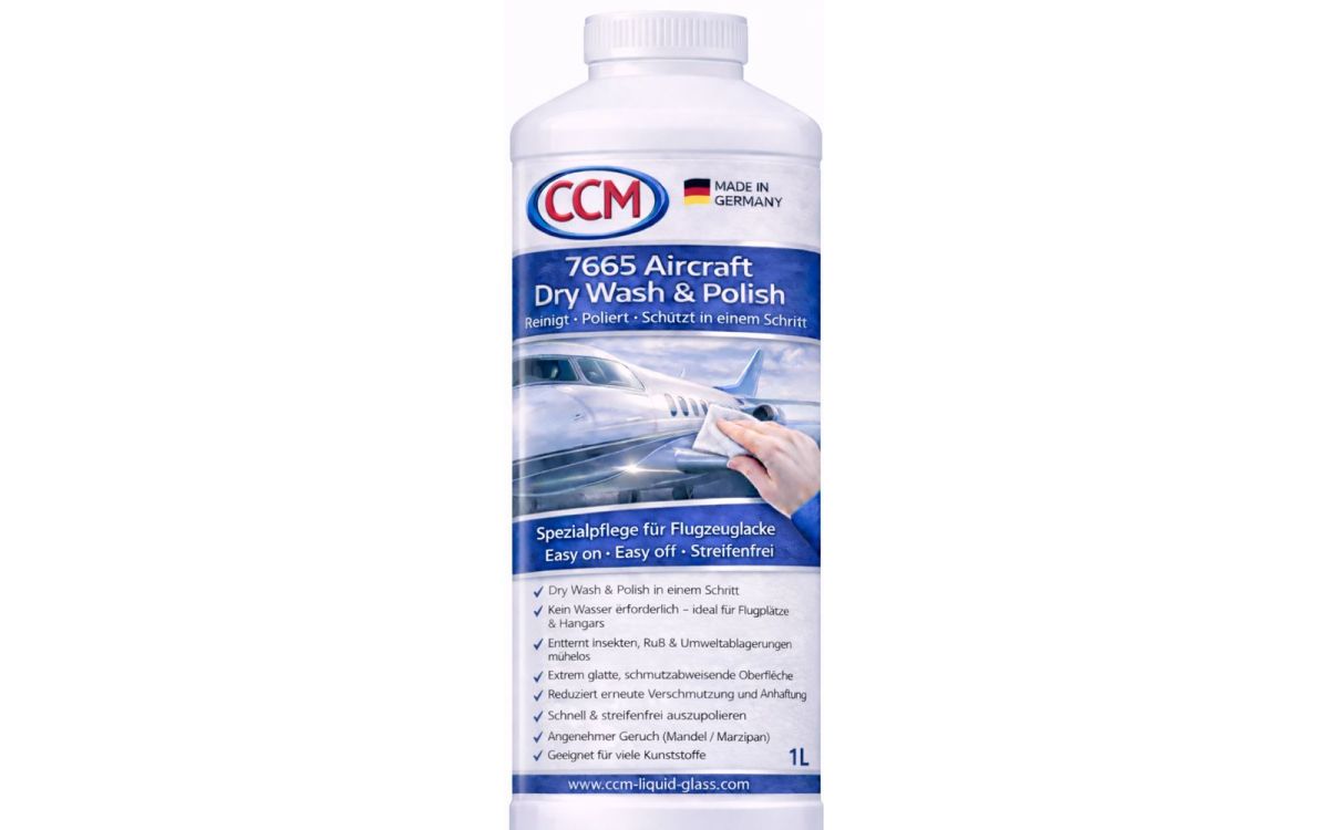 (IINews) - Overath, Deutschland - Die CCM GmbH erweitert ihr Portfolio im Bereich Luftfahrtpflege um das Produkt CCM® 7665 Aircraft Dry Wash&Polish. Die neu entwickelte Spezialpolitur ist für die wasserlose Reinigung und Pflege von Flugzeugoberflächen konzipiert und richtet sich an professionelle Anwender wie Aircraft Detailer, Fliegerclubs und Wartungsbetriebe.