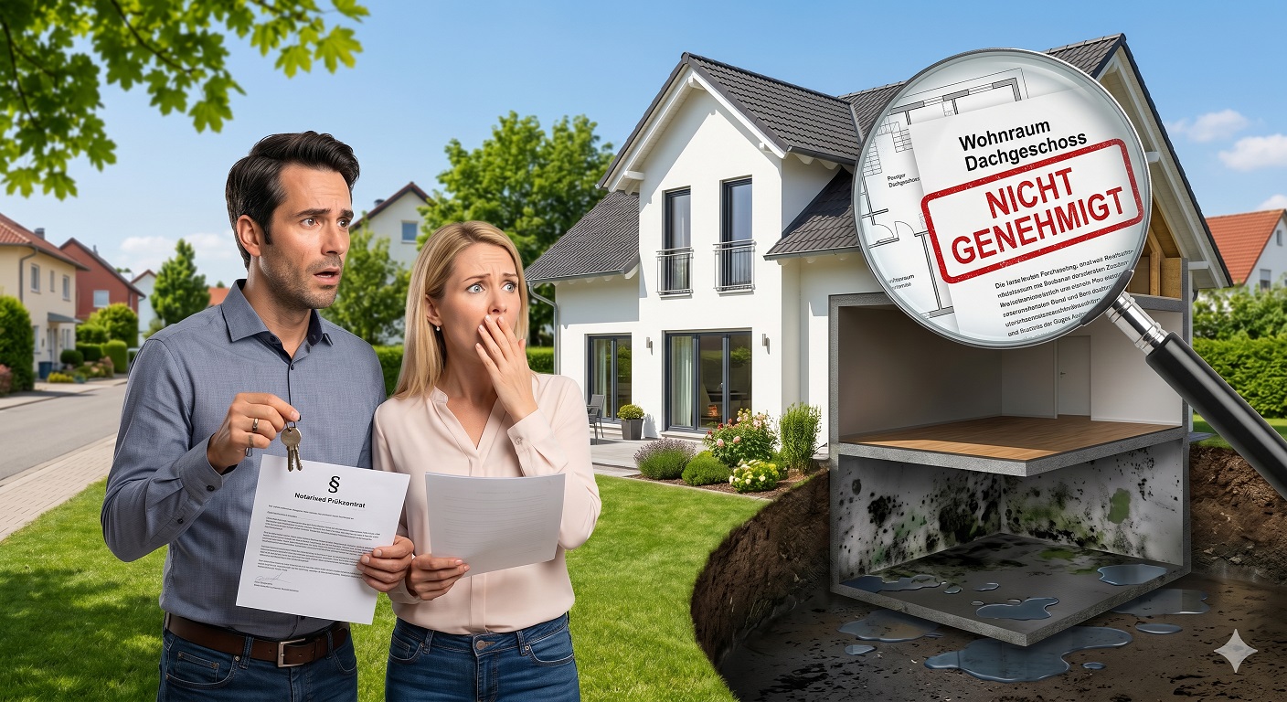 Typische Fälle sind etwa ein undichter oder dauerhaft nasser Keller, verdeckter Schimmelbefall, Feuchtigkeitsschäden, massive Probleme am Dach, nicht fachgerecht ausgeführte Umbauten oder der Umstand, dass ein als Wohnraum genutztes Dachgeschoss tatsächlich gar nicht über die erforderliche Baugenehmigung verfügt. Gerade letzteres kann für Käufer besonders folgenreich sein, wenn Räume als Wohnfläche verkauft wurden, rechtlich aber gar nicht als solche genutzt werden dürfen.