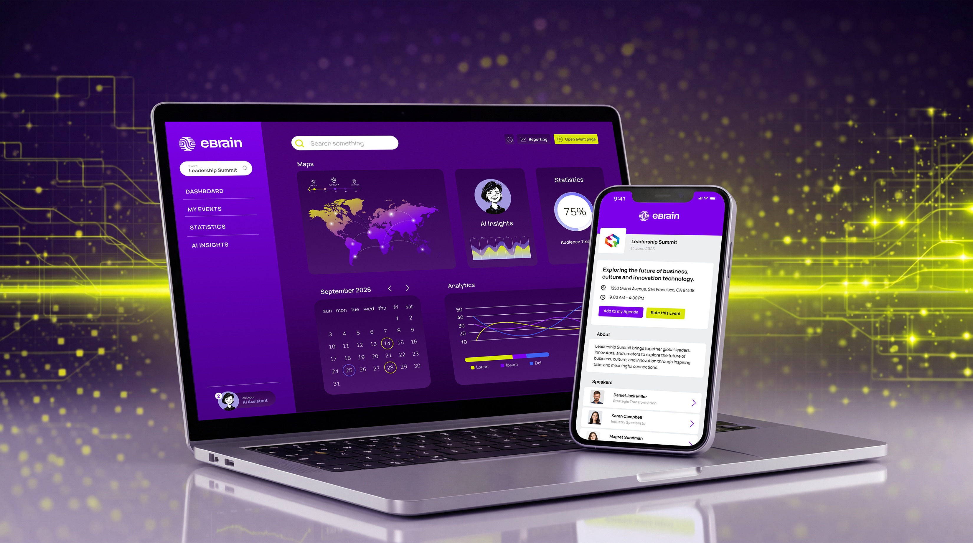 eBrain geht einen anderen Weg. Die Plattform verbindet Registrierungswebsite, Teilnehmermanagement, Kommunikation, Kontingente, Change Management, Onsite-Prozesse, Reporting und Analytics in einem durchgängigen, KI-zentrierten System. Integrierte KI-Assistenten und AI Agents führen Anwender durch Prozesse, erzeugen Inhalte, priorisieren Aufgaben, analysieren Daten, unterstützen operative Entscheidungen und reduzieren manuelle Reibungsverluste entlang der gesamten Event Journey. Damit entsteht ein klarer Paradigmenwechsel: weg von Event Admin — hin zu Event Intelligence.