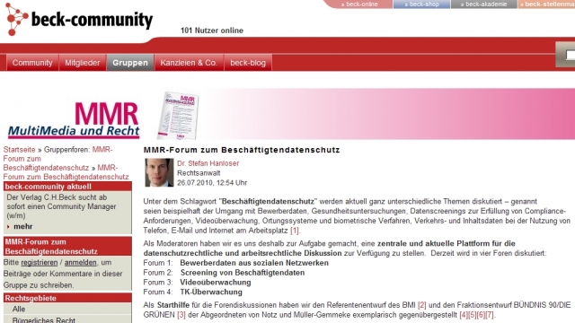 (IINews) - München, 27. Juli 2010 - Lidl, Telekom, Deutsche Bahn und jüngst wohl auch der Textil-Discounter KiK - die Skandale um Datenschutzverstöße in großen Firmen reißen nicht ab. Jetzt sollen Arbeitnehmer in die Gesetzgebung zu einem verbesserten Beschäftigtendatenschutz mit einbezogen werden. Dazu hat die Bundestagsfraktion Bündnis90/DIE GRÜNEN einen eigenen Rohentwurf für ein Arbeitnehmer-Datenschutzgesetz veröffentlicht und zur Diskussion im Internet freigegeben. Der Entwurf kann in Abstimmung mit der Bundestagsfraktion auch seit heute unter www.beck-community.de, dem Community-Portal des führenden juristischen Fachverlages C.H.Beck, eingesehen und kommentiert werden. Die Registrierung ist kostenfrei und unverbindlich.