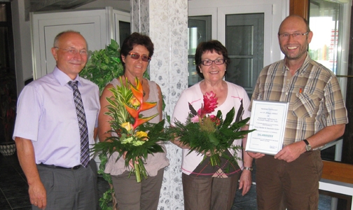 Fredy Neumeister, zuständiger Gebietsverkaufsleiter bei SIP gratulierte der Geschäftleitung Erika Steinmetz, Willi und Heidi Häussler. "Seit 20 Jahren fertigen wir nun Kunststofffenster- und Türen aus Salamander Profilen. Wir sind sehr zufrieden über die langjährige Partnerschaft mit SIP und schätzen besonders deren optimale Qualität, Flexibilität und zügige Auftragsverwaltung" erklärt Erika Steinmetz.