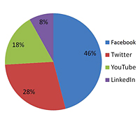 Das Online-Portal Facebook steht bei den befragten Firmen an oberster Stelle auf der Beliebtheitsskala: 69 Prozent aller Studienteilnehmer gaben an, Mitglieder bei Facebook zu sein. Auch sehr populär sind Twitter (44 Prozent), YouTube (32 Prozent) und LinkedIn (23 Prozent).