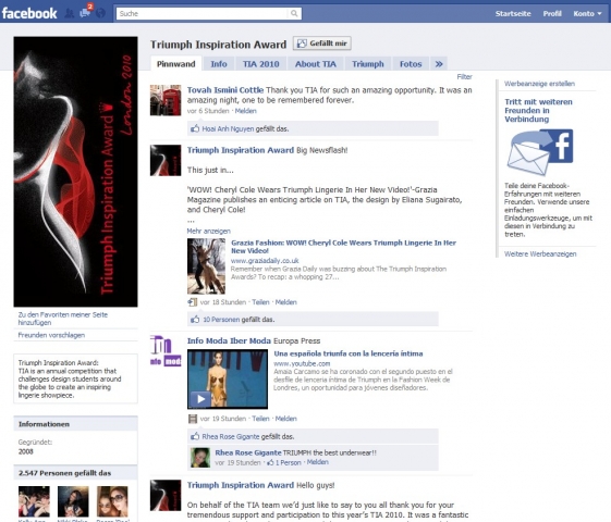 (IINews) - München, 28. September 2010 - Seit 2008 lädt Triumph weltweit junge Modedesign-Studenten zum jährlichen Design-Wettbewerb ein. Auch im Jahr 2010 wurden wieder Lingerie-Kreationen in 27 Ländern ausgezeichnet. Der Sieger wurde durch eine Jury ermittelt und am 16. September in London mit dem Triumph Inspiration Award 2010 gekürt. Um die Kommunikation rund um den Award zu erweitern, hat edicos die nationalen Triumph-Websites strukturell um einen Punkt "Award" erweitert, eine WCMS-Schnittstelle zu Facebook erstellt und ein internationales Voting eingeführt. edicos hat das Projekt als Erweiterung des kürzlich realisierten weltweiten Website-Relaunchs umgesetzt.