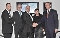 (v.l.n.r.: Andy Jones, European Managing Director von Edgetech, Heinsbergs Bürgermeister Wolfgang Dieder, Edgetech-Vorstandsvorsitzender Michael B. Hovan, NRW.Invest-Geschäftsführerin Petra Wassner und WFG-Geschäftsführer. Joachim Steiner), Foto: Edgetech
