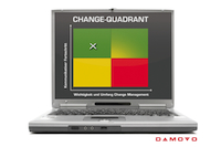 Zur Auswertung bietet Damovos Webportal für Change-Kommunikation mehrere Möglichkeiten an. In einer kostenlosen Kurzanalyse sehen Führungskräfte sofort nach Beantwortung der Fragen, wo sie stehen. Das Ergebnis wird in einem Change-Quadranten mit den Achsen „Wichtigkeit und Umfang von Change-Management“ (x-Achse) sowie „Kommunikativer Fortschritt“ (y-Achse) dargestellt. Die größten Herausforderungen ergeben sich für Unternehmen, die häufig wichtige Change-Management-Anforderungen bewältigen müssen, aber nicht die passenden Instrumente im Einsatz haben, um Veränderungen schnell und wirksam zu kommunizieren und umzusetzen.