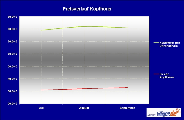 Betrachtet werden Kopfhörer (http://www.billiger.de/show/kategorie/8937.htm) in den Bauarten mit Ohrenschale und In-ear-Kopfhörer. Die Kopfhörer mit Ohrenschale sind momentan sehr beliebt und das Interesse der billiger.de-Nutzer nimmt hier seit Juli stetig zu. Die Durchschnittspreise stiegen von Juli bis August um 3 Euro auf 82 Euro an und sanken im September auf 81 Euro. Interessante Unterschiede stellt der Preisvergleich bei einem genauen Vergleich der Hersteller: Bei den drei Marken, die in den letzten drei Monaten am meisten nachgefragt wurden, sind die Preise angestiegen. Namentlich sind das Sennheiser, Monster Cable und Sony. Die Angebote von Sony wurden bei billiger.de im Durchschnitt 10 Prozent teurer, und die Preise für die momentan auf dem Portal begehrtesten Kopfhörer von Monster Cable (http://www.billiger.de/show/kategorie/8937%28brand=f_brand_1879961%29.htm) stiegen um 3 Prozent. Produkte von Sennheiser fielen zunächst im Preis, stiegen dann aber im September wieder um 2 Prozent an und lagen zuletzt bei durchschnittlichen 109 Euro - und damit im Preis höher als noch im Juli. Bei den Marken allerdings, die auf dem Preisvergleichsportal weniger Interesse wecken, ist die Entwicklung genau umgekehrt. So fielen die Durchschnittspreise der Kopfhörer von JVC zum Beispiel seit Juli um 44 Prozent auf 34 Euro. Die Angebote des weniger bekannten Herstellers Beyerdynamic wurden immerhin 9 Prozent günstiger.