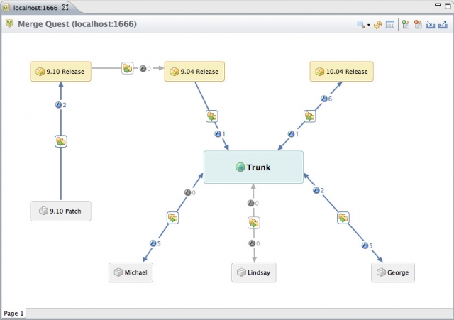 Mit Merge Quest können Entwickler sofort gegenseitige Abhängigkeiten der verschiedenen Verzweigungen (Mainline, Development oder Release) unabhängig von der verwendeten Entwicklungsmethode erkennen. Verzweigungsabhängigkeiten werden zwischen verwandten Entwicklungspfaden zusammen mit der Anzahl der noch ausstehenden Integrationen angezeigt, so dass Manager den Zusammenführungsaufwand abschätzen können.