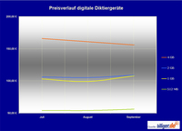 Bei Aufnahmegeräten mit 512 MB internem Speicher blieb der Durchschnittspreis im Juli und August gleichbleibend bei 54 Euro. Im September war eine Preiserhöhung von knapp 4 Prozent zu beobachten. Die Kurve bei Diktiergeräten mit 1 GB Speicher ging zunächst um 4 Prozent nach unten, und der durchschnittliche Preis sank im August unter die 100-Euro-Grenze. Im September erfuhren die 1-GB-Geräte jedoch eine Erhöhung um 9 Prozent, der Preis kletterte auf durchschnittlich 108 Euro. Wer sich zu einer Investition in dieser Preisklasse entschieden hat, kann durch einen kurzen Preis-Check aber schon ein Aufzeichnungsgerät mit 2 GB Speicher finden, der Durchschnittspreis beider Kategorien ist in etwa gleich. Auch bei digitalen Diktiergeräten mit 2 GB großem Speicher kam es im August zunächst zu einem knapp 1-prozentigem Preisabfall, im September aber zu einem Anstieg des Durchschnittspreises um fast 4 Prozent auf nun 109 Euro.