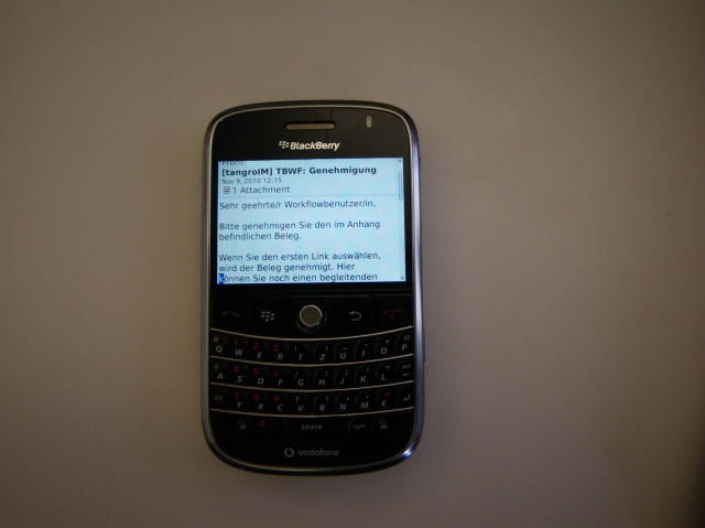 (IINews) - Heidelberg, 10. November 2010 - tangro stellt seinen tangro Business-Workflow zur Automatisierung von Freigabe- und Genehmigungsprozessen in einer mobilen Variante für Smartphones wie z.B. den BlackBerry zur Verfügung. Damit kann der gesamte Freigabe- und Genehmigungsprozess standortunabhängig über einen beliebigen Mail-Client, etwa Outlook, abgewickelt werden. Als besonderen Vorteil der Smartphone-Lösung benötigt der Nutzer weder eine SAP-Userlizenz, noch muss ein tangro-User eingerichtet sein.