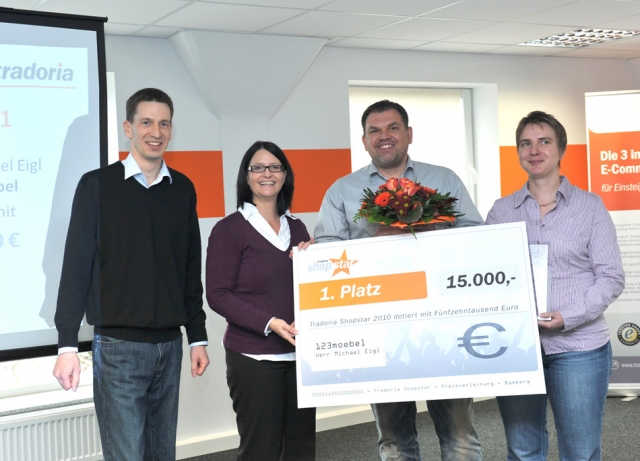 Ein Paradebeispiel für nachhaltige wirtschaftliche Erfolge ist auch Michael Eigl, Erstplatzierter des Shopstar-Wettbewerbs, der seit der Registrierung mit seinem Onlineshop 123moebel.de auf Tradoria.de bemerkenswerte Ergebnisse verbuchen konnte. Auf die Frage nach seinem Erfolgsgeheimnis antwortet der 41-jährige: "Neben dem Sortiment und der Usability meines Onlineshops ist vor allen Dingen die besondere Serviceleistung von Tradoria für meinen Erfolg verantwortlich. Was Tradoria in den letzen drei Jahren auf die Beine gestellt hat, ist wirklich sehr beeindruckend. Als Tradoria-Anbieter kann ich mich ganz auf die Gestaltung meines Sortiments und die Betreuung meiner Kunden konzentrieren - besser geht es einfach nicht", resümiert der Shopstar-Gewinner, der sich über 15.000 EUR freuen kann. Bleibt abzuwarten, welche Kriterien das Tradoria Team für den nächsten Wettbewerb anlegt. Fest steht: 2011 geht der Tradoria Shopstar in die nächste Runde.