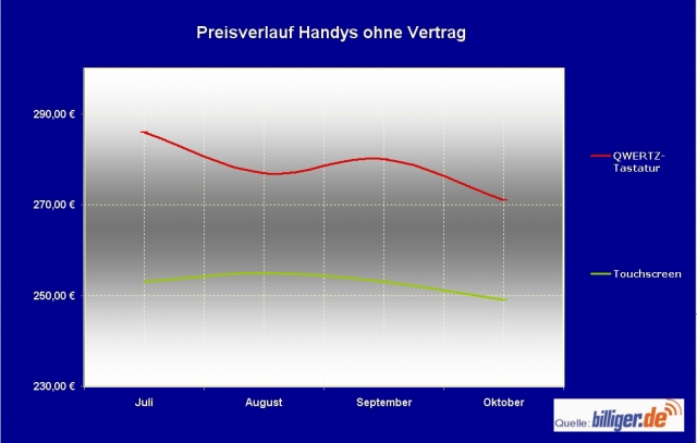 Wer ein Handy mit Qwertz-Tastatur bevorzugt, kann sich ebenfalls freuen, denn auch hier ist der Durchschnittspreis seit Juli um 5 Prozent gefallen. Im Schnitt mehr als 60 Euro weniger bezahlte der billiger.de-Nutzer zum Beispiel im Oktober (im Vergleich mit Juli), wenn er sich für ein Handy der Marke Nokia entschied. Auch für Geräte des Herstellers Sony Ericsson musste der Käufer durchschnittlich 10 Prozent weniger bezahlen als noch im Juli. Sony Ericsson ist damit die einzige Marke, bei der der Preis im Durchschnitt bei beiden Handytypen ausschließlich gesenkt wurde. Die beliebten BlackBerrys stiegen bis September zunächst im Preis an, bevor auch sie sich einreihten in den leichten Abwärtstrend. Im Oktober lag der Durchschnittspreis der Blackberry-Telefone zwar 3 Prozent höher als im Juli, allerdings zuletzt mit Tendenz nach unten. Für Geräte von Samsung müssen Käufer seit September wieder etwas tiefer in die Tasche greifen: Der Durchschnittspreis steigerte sich seitdem um 5 Prozent. Allerdings wurde er bei billiger.de im August so weit gesenkt, dass der Preis zuletzt im Schnitt auch hier niedriger war als noch im Juli, nämlich insgesamt 13 Prozent.
