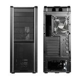 Der Innenraum ist beim Xigmatek Pantheon Midi-Tower komplett schwarz lackiert und bietet viel Platz für üppige Komponenten. Der Mainboard-Tray besitzt einen großen Ausschnitt, so dass Kühler mit Backplate ohne den Ausbau der Hauptplatine (de-)montiert werden können. Weitere Kabel-Durchführungen lassen die Kabel auf der Rückseite des Mainboard-Trays verschwinden, was in einem aufgeräumten Innenraum resultiert. Dieser Effekt kommt besonders gut bei der Window-Variante des Pantheons zur Geltung.