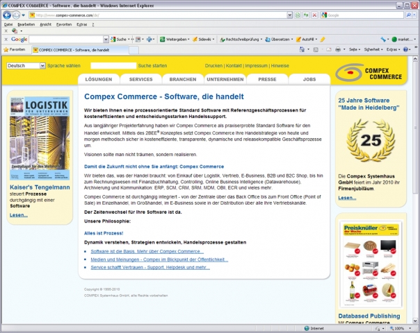 (IINews) - Compex, Spezialist für Standard Software im Groß- und Einzelhandel, feiert sein 25-jähriges Firmenjubiläum nicht nur mit einem neuen Release mit vielen neue Funktionalitäten, sondern auch mit einem neu gestalteten Internetauftritt. Neben Produkten und Dienstleistungen, einem eigenen Presse- und Karrierebereich informiert der übersichtliche und klar strukturierte Internetauftritt in verschiedenen Sprachen auch über die Geschichte und Entwicklung des Unternehmens.