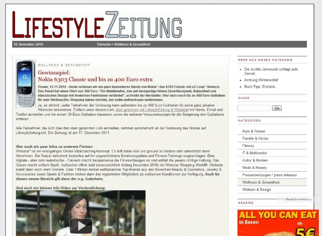 Alle Teilnehmer, die sich über den Link auf www.lifestyle-zeitung.de bei Webstar* anmelden, nehmen automatisch an der Verlosung des Nokias* auf LifestyleZeitung teil. Die Ziehung ist am 17. Dezember 2011.