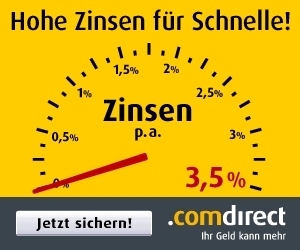 Von den insgesamt 30.000 Tagesgeldkonten im Rahmen der Zins-Aktion der comdirect bank mit 3,50 % Zinsen p.a. sind nur noch weniger als 5.000übrig, welche in wenigen Tagen vergriffen sein werden.