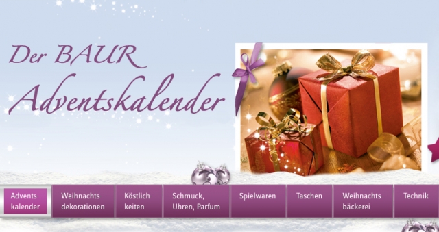 Auch der BAUR Versand möchte ab 1. Dezember jeden Tag aufs Neue überraschen. Deshalb gibt es im extra angelegten Weihnachtsshop auf http://www.baur.de/adventskalender einen Online-Adventskalender. Auf den Kunden warten tolle Geschenkideen zu weihnachtlichen Preisen und attraktive Gratis-Aktionen.
