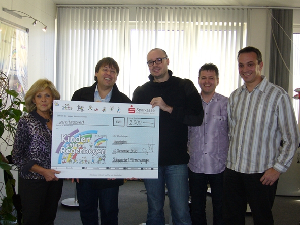 (IINews) - Mannheim, 13.12.2010: Die Schweickert Firmengruppe unterstützt in diesem Jahr die Aktion "Kinder unterm Regenbogen". Am Spendenmarathon 2010 übergaben die Geschäftsführer der Schweickert Netzwerktechnik GmbH und Schweickert Elektrotechnik GmbH einen Scheck in Höhe von 2.000 Euro an die gemeinnützige Organisation.