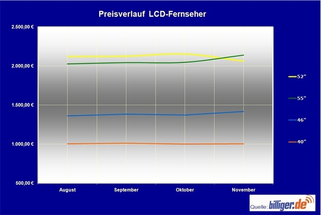 Bei den kleinen Flachbildfernsehern hält sich das Preisniveau seit August stabil. Obwohl es im September und Oktober zunächst zu einer Erhöhung des Durchschnittspreises bei 19-Zoll-Geräten kam, liegt der mittlere Preis im November mit 248 Euro knapp 1 Prozent unter dem Augustpreis. Wenig Bewegung ist auch bei LCD-TVs mit 26 Zoll großem Display zu erkennen, der Preis pendelte sich im November bei 382 Euro im Schnitt ein und liegt damit weiterhin auf dem Preisniveau von August. Nur in der Kategorie der LCD-Fernseher (http://www.billiger.de/show/kategorie/2060.htm) mit 22-Zoll-Display kam es zu einer Anhebung des durchschnittlichen Kaufpreises um 2,1 Prozent, mit 295 Euro liegt dieser gerade noch unter der 300-Euro-Grenze.