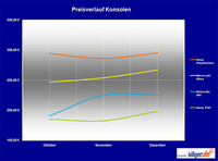 Sichtbar geringer fiel der Preissprung bei der Sony PlayStation (http://www.billiger.de/show/produkt/78746624-Sony-PS3-Slim-120-GB-schwarz.htm) aus: Im November sank der durchschnittliche Preis zunächst um knapp 3 Prozent von rund 294 Euro auf rund 286 Euro. Aber auch hier kam es im Dezember zu einem Anstieg des Durchschnittspreises, der mit 295 Euro leicht über dem Ausgangspreis im Oktober liegt. Die Preiskurve der tragbaren PSP von Sony zeigt klarer nach oben: Insgesamt über 7 Prozent höher ist der Durchschnittspreis vom Dezember im Vergleich zu dem vom Oktober. Wie beim stationären großen Bruder sank der Preis zwar im Oktober (-1,46 Prozent), um dann aber im Dezember um 8,7 Prozent zuzulegen. Dem Tiefpreis von rund 182 Euro im November steht der durchschnittliche Preis von rund 198 Euro im Dezember gegenüber.