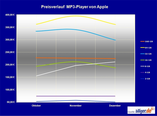 Eine konstante - wenn auch geringe - Preissenkung kann nur der iPod classic (http://www.billiger.de/show/produkt/84362759-Apple-iPod-classic-160GB-8-Generation-schwarz.htm) mit 160 GB Speicher verzeichnen: Um insgesamt rund 1,5 Prozent sank der durchschnittliche Preis im Erhebungszeitraum und liegt im Dezember knapp unter 225 Euro.