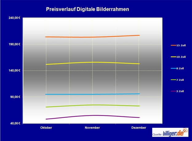 Ein etwas anderes Bild zeichnet die Preiskurve bei den 15 Zoll großen digitalen Bilderrahmen: Der durchschnittliche Preis von rund 204 Euro im Oktober fiel zunächst um 0,2 Prozent im November. Nach einem Preisanstieg von 1,7 Prozent war der Durchschnittspreis im Dezember dann aber mit fast 207 Euro höher als im Oktober.