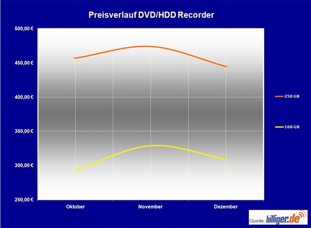 Die Preiskurve für DVD Recorder (http://www.billiger.de/show/kategorie/29369%28page=3%29.htm) mit einer 250 GB großen integrierten Festplatte weist eine ähnliche Tendenz auf. Auch hier kam es im November zunächst zu einer Erhöhung des durchschnittlichen Preises. Von 457 Euro stieg der Durchschnittspreis um fast 4 Prozent auf 474 Euro im November. Durch eine ebenfalls rund 6-prozentige Preissenkung im Dezember sank er sogar unter den Ausgangspreis im Oktober. Mit im Schnitt rund 445 Euro schlug ein Kauf im Dezember zu Buche.