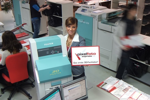 Die Bilder werden im Lentikular-Druckverfahren produziert, bei dem der Thermosubli-mationsdrucker eine Aufnahme in nur dreieinhalb Minuten im Direktdruck auf einen 15 x 22 cm großen Lentikularbogen aufbringt. Dieses sehr aufwendige Druckverfahren ist bislang nur in Japan möglich gewesen, so dass die Bearbeitungszeit für Bildbestellungen bei ca. 20 Tagen lag. PixelfotoExpress hat nun in seinem 3D-Fotolabor einen 3D Printer Typ DRP-1 von FUJIFILM stehen und ist in der Lage, innerhalb von 24 h, die individuellen 3D-Fotos seiner Kunden zu drucken und zu versenden.
