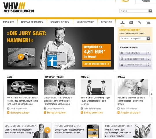 (IINews) - München, Hannover 08. Februar 2011 - Die VHV Versicherungen, einer der größten Auto- und Haftpflichtversicherer in Deutschland, haben ihre Website komplett überarbeitet. Die neue www.vhv.de ist mit web-optimierten Texten, modernem Design und klarer Zielgruppenansprache für Privatkunden, Firmenkunden und Interessenten besonders nutzerfreundlich gestaltet. Insgesamt bietet www.vhv.de umfangreiche Informationen zu acht Sparten mit 30 Produkten im Privatkundenbereich und zu 60 Produkten für zehn Branchen im Firmenkundenbereich. Ein optimierter Online-Schadenservice sorgt für eine komfortable Schadenmeldung. Informationen zum Unternehmen, zu Karriere- und Ausbildungsangeboten sowie der Pressebereich wurden ebenfalls neu gestaltet. Zudem laufen die Dieter Bohlen Spots der aktuellen Werbekampagne auf der Website. Auch unter der Haube glänzt der neue Auftritt: Für hohe technische Performance, effiziente redaktionelle Prozesse und eine leichte Aktualisierung der Inhalte wurde ein neues Web Content Management System (WCMS) implementiert.