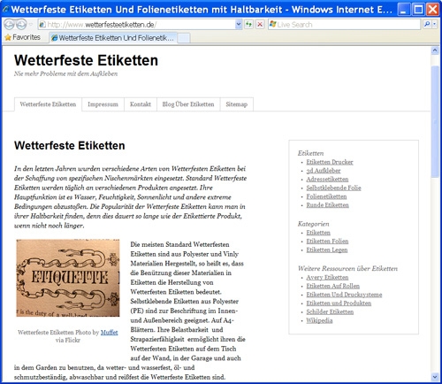 Portal http://www.wetterfesteetiketten.de ist ein deutsches Portal für Wetterfeste Etiketten. Hier gibt es eine grosse Auswahl an selbstklebenden, runden und meistens wetterfesten Etiketten - Informationen. Dabei wird man über spezifischen Nischenmärkten informiert.