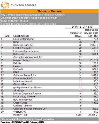 Concentro erreicht Platz 7 in der der aktuellen Version der Thomson Reuters League Table Mid-Market 2010