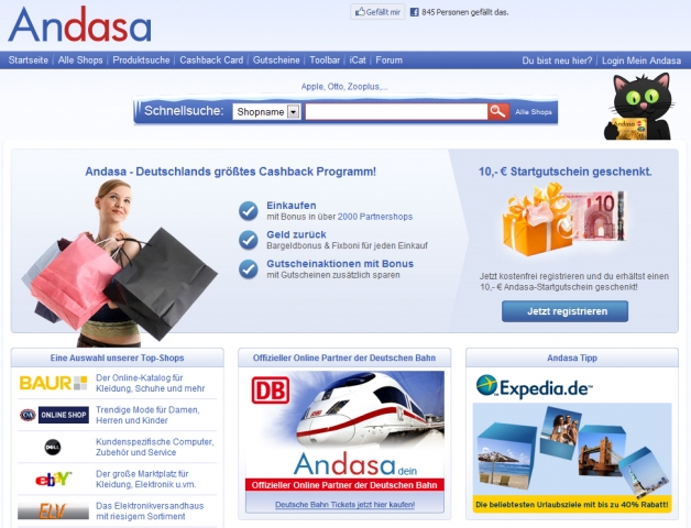 Über Andasa: Andasa ist mit mehr als 2000 Shops in 27 Kategorien und einer Produktsuche mit über 60 Millionen indizierten Produkten Deutschlands größtes Cash Back Programm. Das Portal bietet einen tagesaktuellen Gutscheinblog, Übersichten über versandkostenfreie Shops, Shops mit dem Trusted Shops® Siegel und tägliche Sonderangebote. Registrierte Nutzer können sich jeden Einkauf mit 2% Bargeldbonus vergüten lassen, der ab einem Betrag von 30 Euro auf das Konto des Nutzers überwiesen wird. Bis 31.12.2010 ist der Bargeldbonus auf 4% verdoppelt. Gutscheinrabatte, Sonderaktionen und Bargeldbonus sind miteinander kombinierbar. Andasa zahlt bei Erstregistrierung ein Startguthaben von 10 Euro und einen Extrabonus für geworbene Freunde. Die Nutzung ist kostenlos.