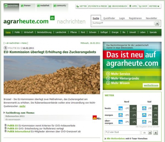 Seit Anfang Februar 2011 präsentiert sich agrarheute.com in neuem, großflächigerem und übersichtlicherem Layout und wurde um Fachbeiträge und Themendossiers ergänzt. Das Portal informiert die