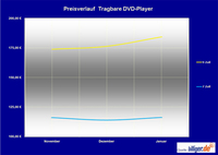 Der Durchschnittspreis für einen tragbaren DVD-Player mit einer Display-Diagonale von 7 Zoll lag im November bei 116 Euro. Im Dezember fiel der Preis um knapp 2 Prozent auf rund 114 Euro. Nach einer ebenfalls rund 2-prozentigen Preisanhebung im Januar lag der durchschnittliche Preis dann knapp über 116 Euro und somit leicht über dem Ausgangsniveau vom November.
