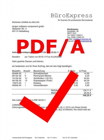Im PDF/A-Dokument sind neben den eigentlichen Texten auch alle Zusatzinformationen wie Erstellungsdatum, Autor oder Schlüsselwörter enthalten. Damit ist dem Beleg bereits die notwendige "Intelligenz" hinterlegt, die ein effizientes Suchen und Selektieren von Belegen im Archiv gewährleistet. Eine zusätzliche Wortliste als unsichtbare Ebene muss nicht mehr hinterlegt werden. Gleichzeitig reduziert sich die Dateigröße im PDF/A-Format auf den Bruchteil einer vergleichbaren TIFF- oder Originaldatei, ohne dass das Dokument an Qualität verliert. Damit benötigen tangro-Dokumente im PDF/A-Format wesentlich weniger Speicherplatz im Archiv. Außerdem wird durch die wesentlich geringere Dateigröße das Versenden der Dokumente per Mail oder FTP-Server erheblich erleichtert.