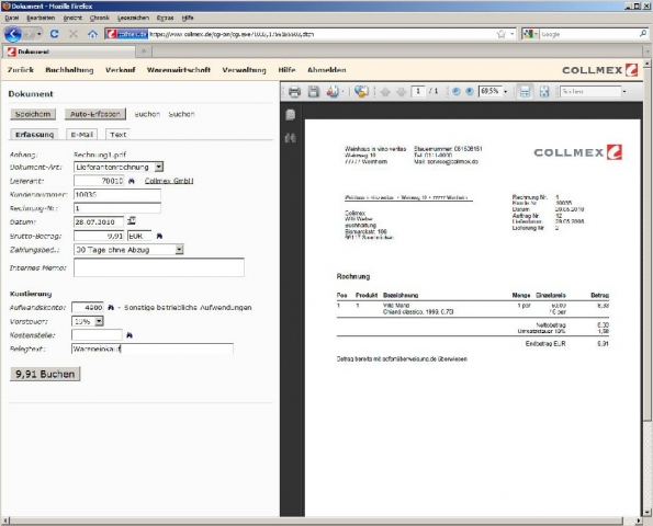 Mit der integrierten Dokumentenverwaltung können Anwender ihre Belege, Rechnungen und Quittungen erfassen, buchen und archivieren - unabhängig davon, ob es sich um elektronische Rechnungen im PDF-Format oder eingescannte Papierdokumente handelt. Besonders praktisch ist die direkte Verknüpfung der so aufbewahrten Dokumente mit den entsprechenden Buchungen. Bei Bedarf lassen sich die Originalbelege per Mausklick anzeigen, ohne lange in der Ablage suchen zu müssen. Bei der Verarbeitung von PDF-Rechnungen sorgt eine automatische Texterkennung dafür, dass Rechnungsinhalte selbständig erfasst werden und so Zeit gespart wird. Bei eingescannten Dokumenten erfolgt eine Texterkennung mittels OCR.
