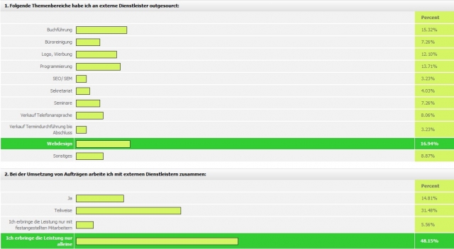 Der Schwerpunkt unter den Outsourcingbereichen liegt im IT-Umfeld: An erster Stelle der ausgelagerten Betriebszweige steht das Webdesign (16,94 %), an dritter und vierter Stelle stehen Programmierung (13,17 %) sowie Logo und Werbung (12,10 %). "IT und EDV sind verständlicherweise sehr beliebte Outsourcingbereiche", weiß Andreas Schilling, Gründer des STRATEGAM-Netzwerkes, "denn gerade in diesem Bereich haben die wenigsten Gründer Ahnung und verfügen auch nicht über die notwendigen Programme." Wer bspw. sein Unternehmen professionell im Internet präsentieren möchte, braucht heute immer noch umfassendes Profiwissen, dessen Eigenerwerb Zeit, Geld und erhebliche Anstrengung kostet. Gerade Bereiche wie Webdesign mit einem relativ kleinen Arbeitsvolumen, aber verhältnismäßig hohen Anforderungen an Technik und Know-how, bieten sich zur Auslagerung an. Daher verwundert es eigentlich, dass nur 3,23 % der von STRATEGAM befragten Unternehmer angaben, firmenfremde Dienste im hochkomplexen Bereich SEO/SEM zu beziehen. Das könnte eher als an fehlendem Interesse daran liegen, dass vielen Outsourcing-Anwendern der Überblick über die vielen möglichen speziellen externen Leistungen fehlt.