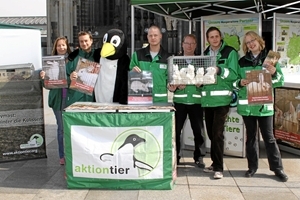 (IINews) - "Wir hatten eine mannshohe Box mit dem Foto einer Kaninchenmast aufgestellt, die mit Sehschlitzen versehen war", erzählt Ursula Bauer von aktion tier. Viele Menschen wagten den Blick hinter die Kulissen und sahen sich den Videoclip über das Leiden der Kaninchen an, der in Innern der Box lief. Auch der Originalkäfig aus einer Kaninchenmastanlage erweckte großes Interesse. Die 5 kleinen Bewohner waren zwar nur aus Plüsch, verdeutlichten aber trotzdem sehr gut die bedrückende Enge und Monotonie des Käfigs. Natürlich war auch das lebensgroße Pinguin-Maskottchen von aktion tier dabei und verteilte eifrig die Kampagnenflyer.
